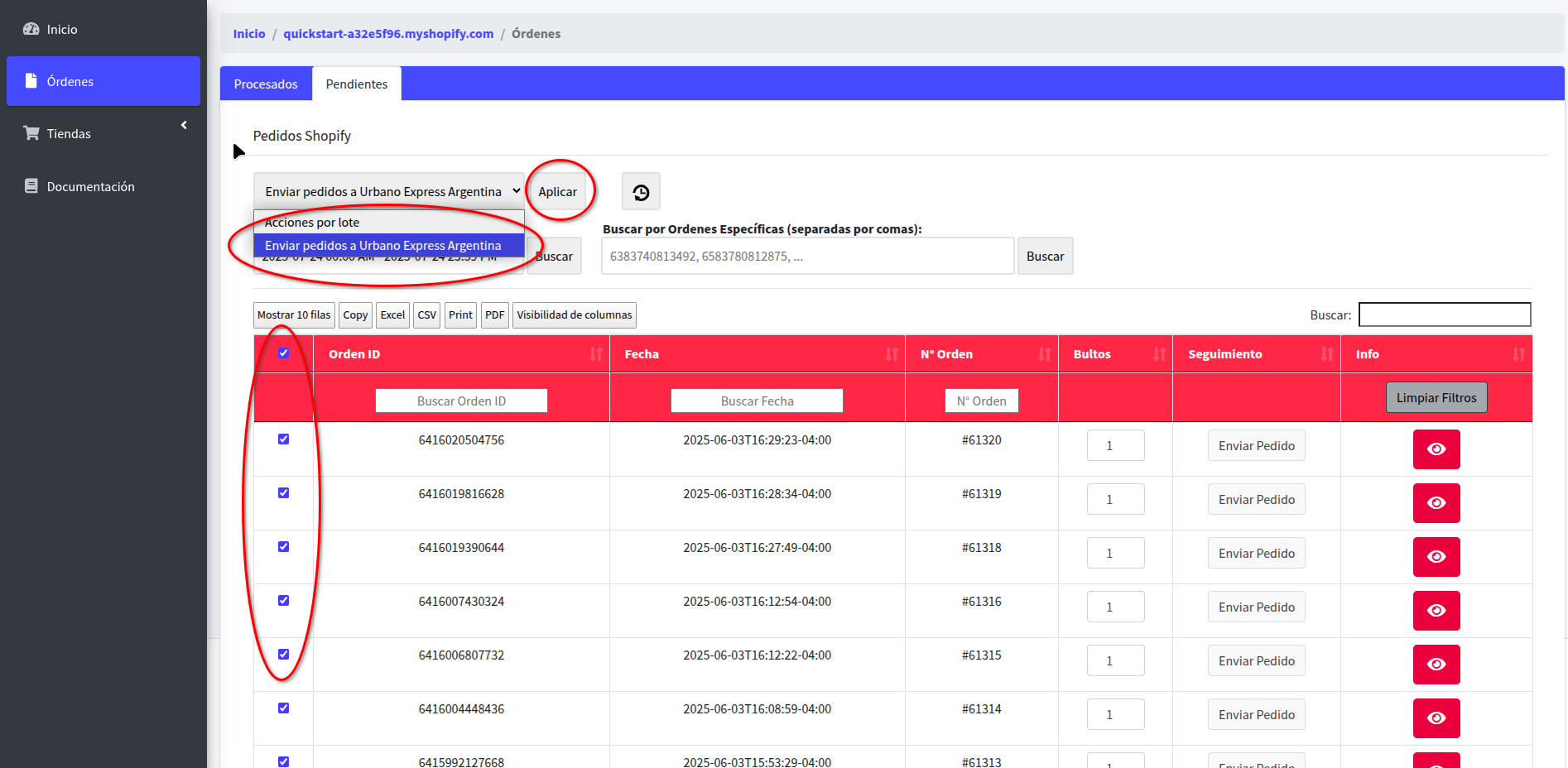 - De forma masiva: (o en Lote), seleccionando las ordenes a enviar y eligiendo en "Acciones por Lote" la opcion "Enviar Pedidos a Urbano Express Argentina", y luego el botón "Aplicar".