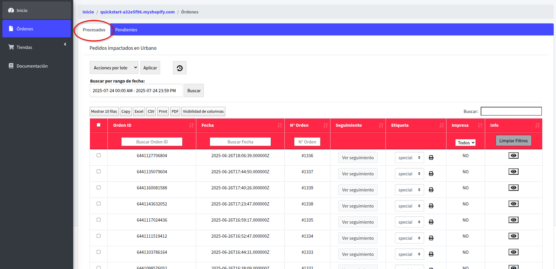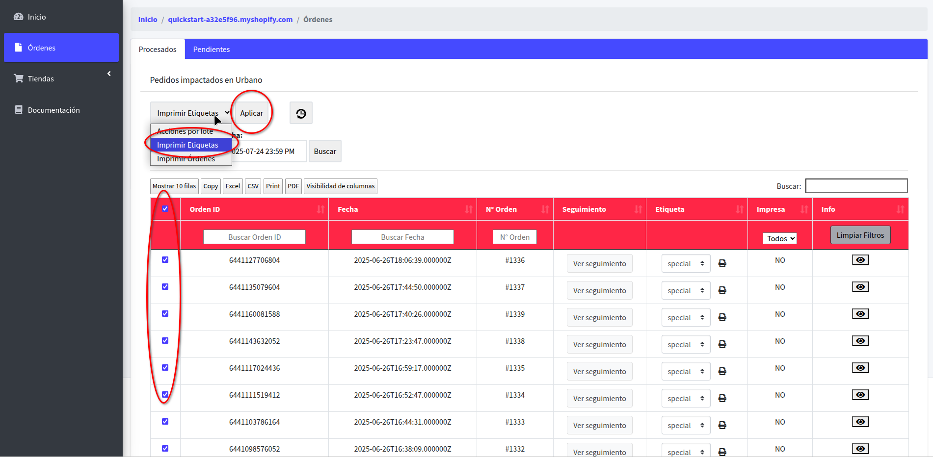 IMPORTANTE: Recuerde que Urbano sólo dejará imprimir las etiquetas cuando el pedido se encuentre en estado PI (Pedido Ingresado),