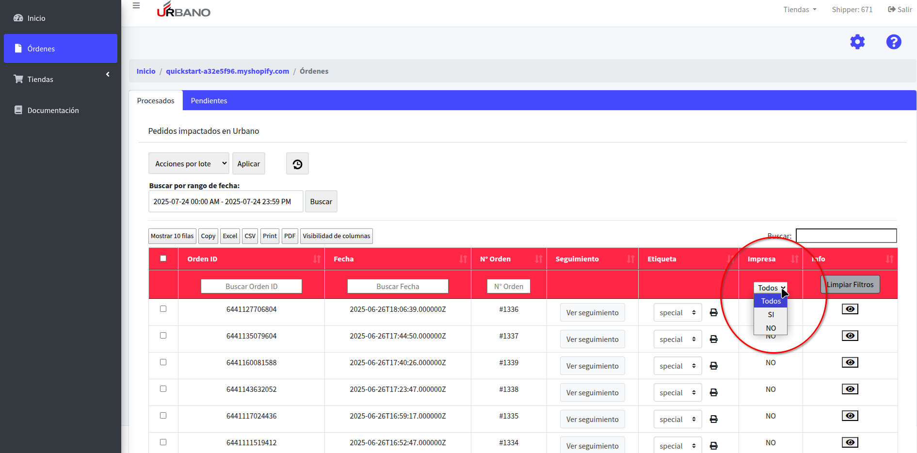 en la columna "Impresa" podrá ver el estado de Impresión de cada Etiqueta, pudiendo asi filtrar por Órdenes que han Impresas o No.