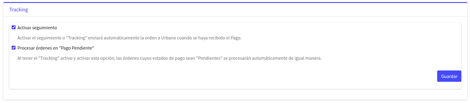 - Tracking Automático: Por defecto se impactarán automáticamente en Urbano todas las Ordenes que hayan recibido el Pago. Para modificar este funcionamiento y hacerlo de forma manual, en caso de que se requiera, se puede des-habilitar esta opción de tracking-automático desde la configuración de su cuenta en la plataforma Integrate.