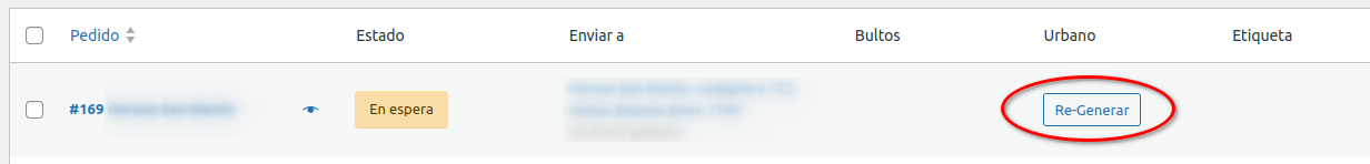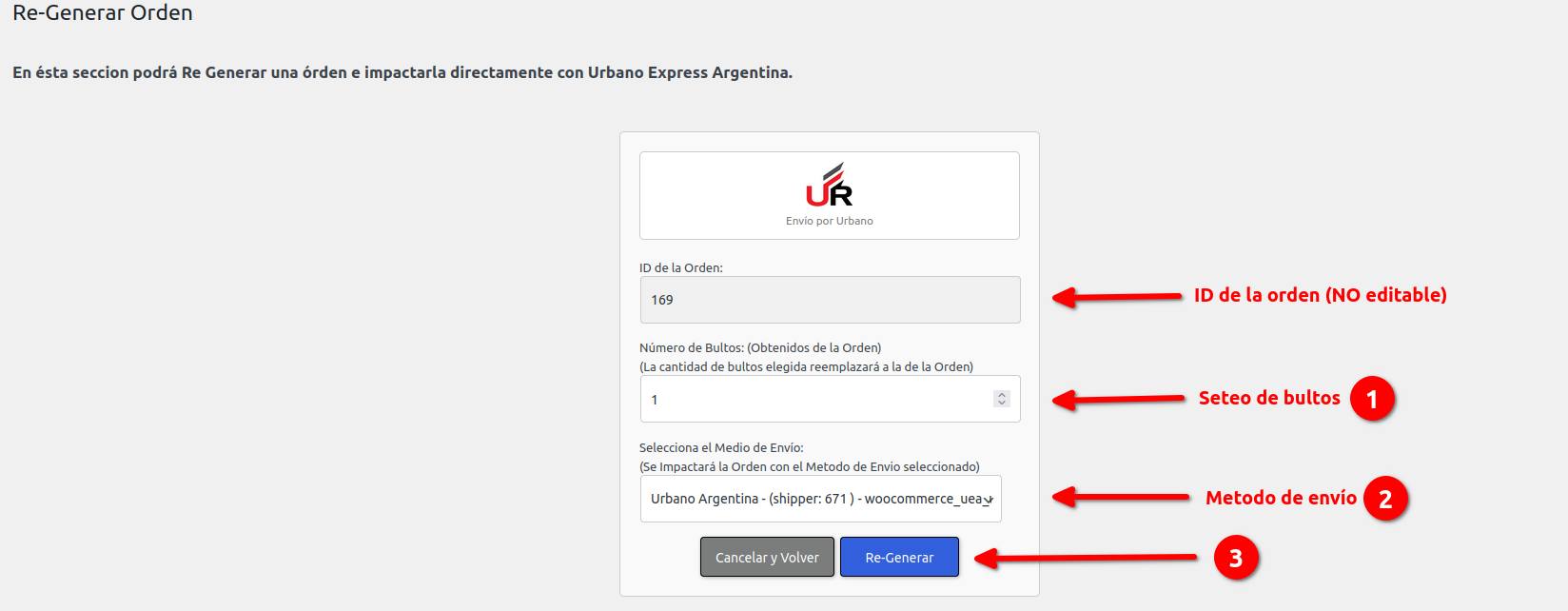 En la Pantalla de Regenerar orden se deberán setear los bultos correspondientes a esa orden y el metodo de envio de Urbano Express.