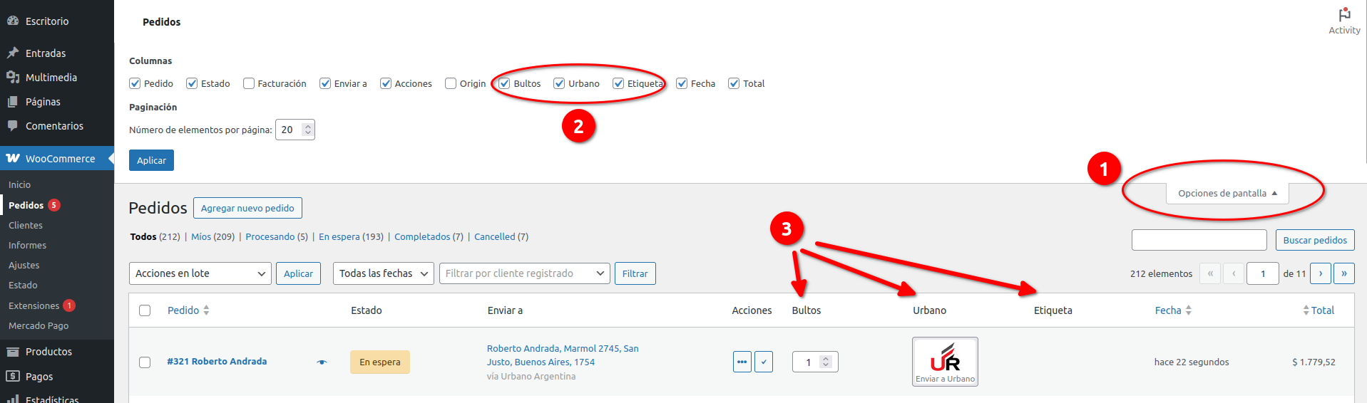 Si al instalar el Plugin, las columnas de Urbano (Bultos, Urbano, Etiqueta) no están visibles, deberemos habilitarlas desde la opcion "Opciones de Pantalla" ubicada en la seccion de Pedidos, en la parte superior Derecha: