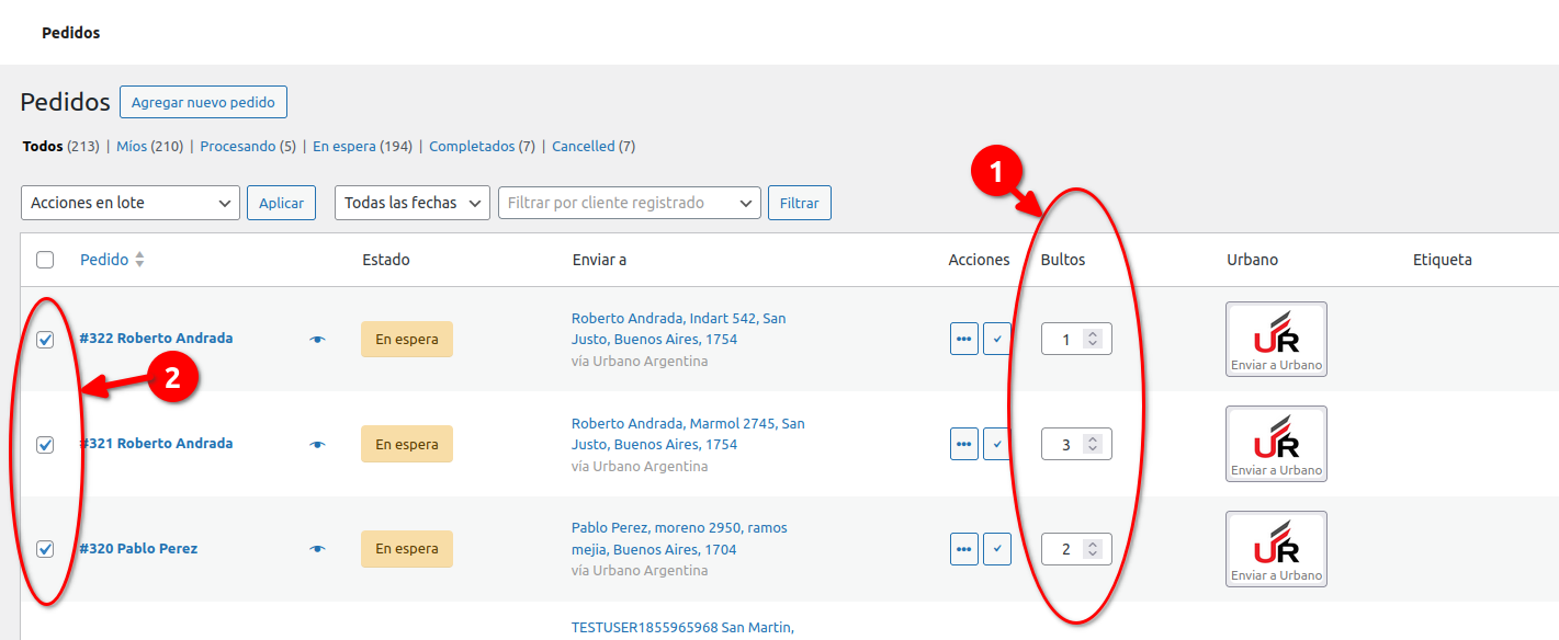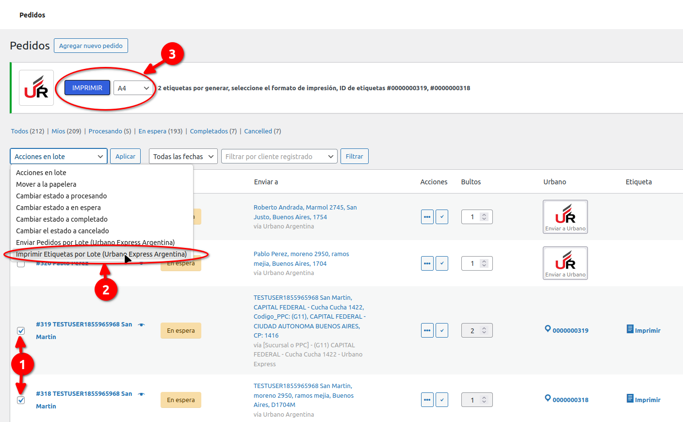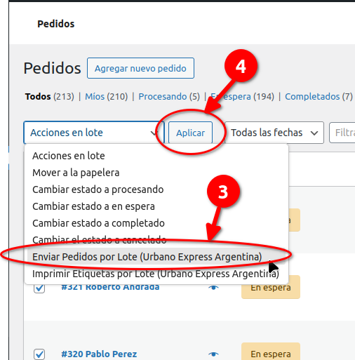 3) En acciones en lote tendremos la opción de "Enviar pedidos por Lote (Urbano Express Argentina)".
